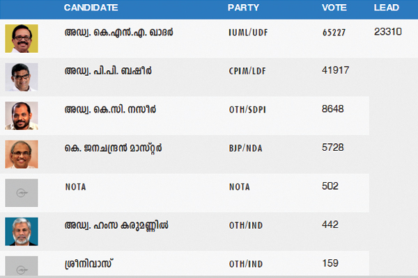ഒമ്പത് മണിയോടെ ഖാദർ ഭൂരിപക്ഷം ഉയർത്തി വിജയത്തിലേക്ക് മുന്നേറുന്നതായി വാർത്തകൾ വന്നു. പത്തേകാലോടെ 23310 വോട്ടിന്റെ ഭൂരിപക്ഷത്തിൽ ഖാദറിന്റെ വിജയ പ്രഖ്യാപനം നടന്നു. വോട്ടെണ്ണൽ ആരംഭിച്ചത് മുതൽ ലീഗ്, സി.പി.എം, ബി.ജെ.പി, എസ്.ഡി.പി.ഐ പ്രവർത്തകർ കൗണ്ടിങ് സ്റ്റേഷന് മുൻപിൽ മുദ്രാവാക്യം വിളിച്ച് നില ഉറപ്പിച്ചിരുന്നു.