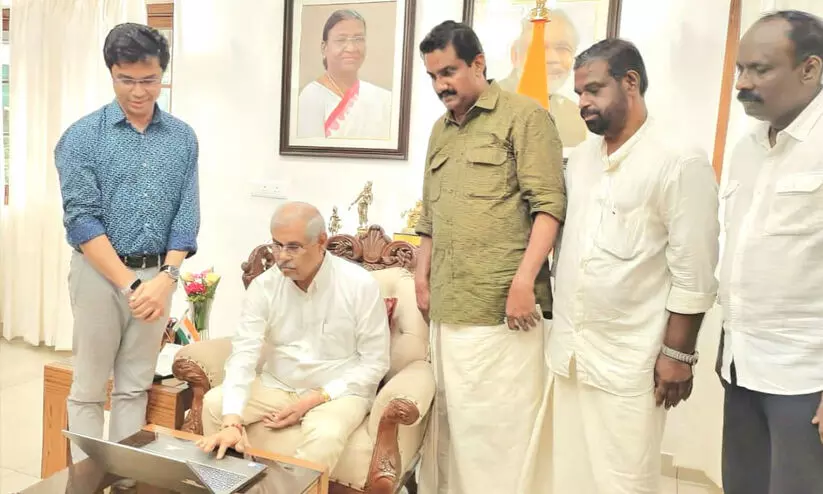 ലഹരി വിപത്തിനെതിരെ കേരള പത്രപ്രവർത്തക യൂണിയൻ സ്റ്റാർട്ടപ് സംരംഭകരായ സൂപർ എ. ഐയുമായി സഹകരിച്ച് നടപ്പാക്കുന്ന ബ്രേക്കിങ് ഡി പദ്ധതിയുടെ വെബ്സൈറ്റ് ലോഞ്ചിങ് ഗവർണർ രാജേന്ദ്ര അർലേകർ നിർവഹിക്കുന്നു