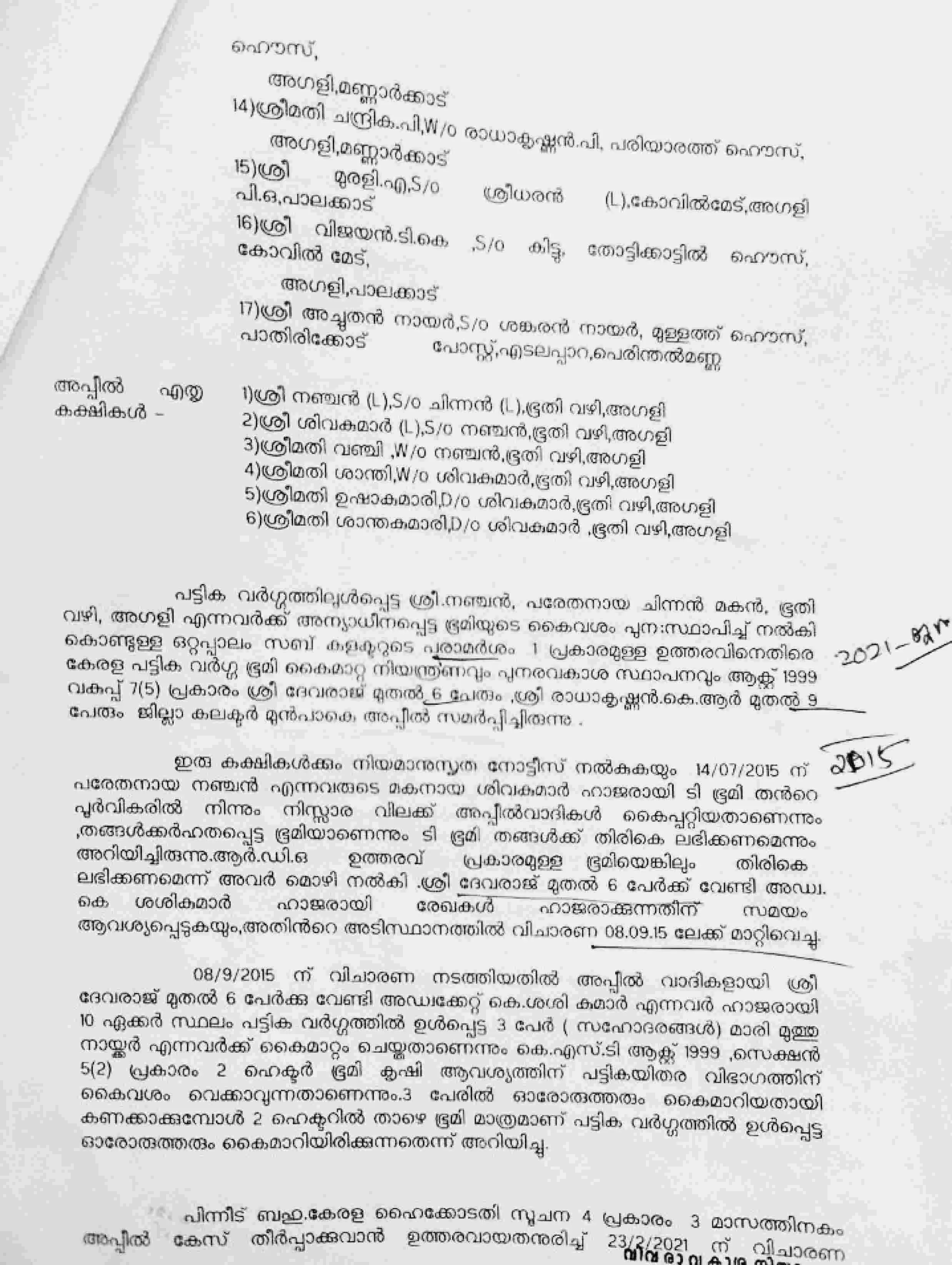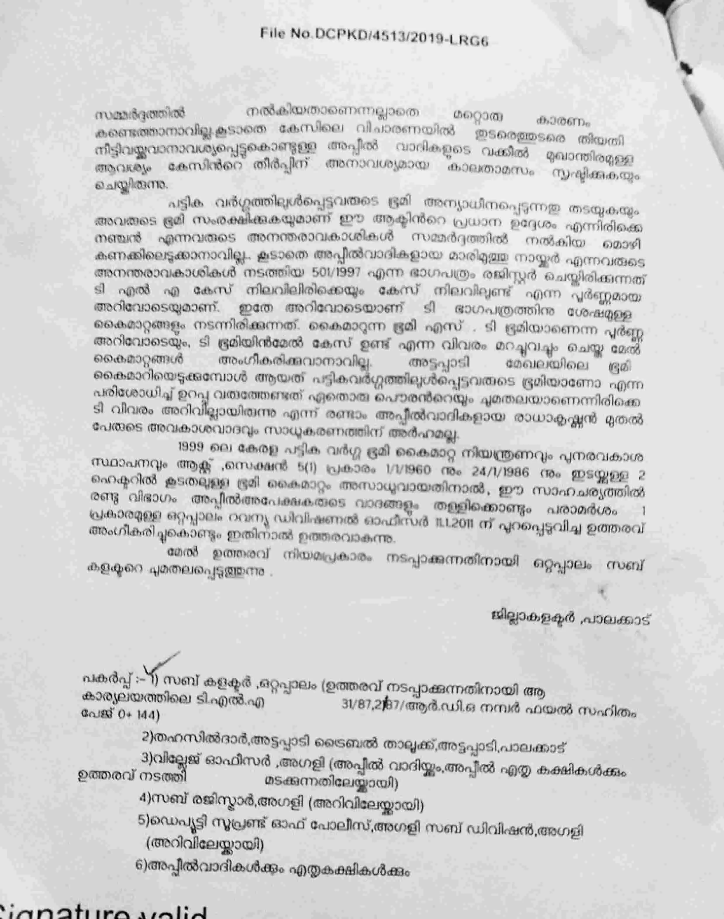 അത് പ്രകാരം അഞ്ചേക്കർ ഭൂമിയിൽ അധികമുള്ളത് തിരിച്ചു പിടിച്ചു നൽകാൻ പാലക്കാട് കലക്ടർ മൃൺമയി ജോഷി 2022 ജനുവരിയിൽ ഉത്തരവിട്ടു. ഉത്തരവ് നടപ്പാക്കാൻ റവന്യൂ ഉദ്യോഗസ്ഥർ ഇതുവരെ തയാറായിട്ടില്ല. അട്ടപ്പാടിയുടെ നിയമ പുസ്തകത്തിൽ ആദിവാസികൾക്ക് അനുകൂലമായ ഉത്തരവുകൾ നടപ്പാക്കേണ്ടതില്ലെന്നാണ് ഉദ്യോഗസ്ഥരുടെ വിശ്വാസം. അത് അട്ടപ്പാടിയിലെ അന്ധവിശ്വാസമാണ്.