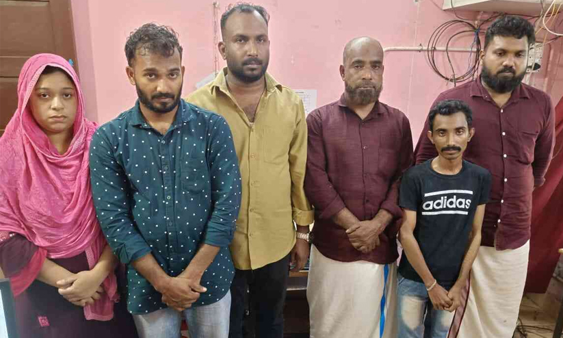 യുവതിയുടെ ഭർത്താവ് പഴകുളം പടിഞ്ഞാറ് ചിറയിൽ കിഴക്കതിൽ അനീഷ് (കുഞ്ഞാസ് 34), സഹോദരി പുത്രൻ താമരക്കുളം മേക്കുംമുറി ഇരപ്പൻപാറ സൗമ്യ ഭവനത്തിൽ ഷിബു (31), ഭാര്യയും ഏർവാടി ഉമ്മച്ചി എന്നയപ്പെടുന്ന മന്ത്രവാദിനിയുമായ ഷാഹിന (23), മന്ത്രവാദി കുളത്തൂപ്പുഴ ചന്ദനക്കാവ് തിങ്കൾ കരിക്കകത്ത് ബിലാൽ മൻസിൽ സുലൈമാൻ (52), സഹായികളായ കുളത്തൂപ്പുഴ നെല്ലിമൂട് ഇമാമുദ്ദീൻ മൻസിൽ അൻവർ ഹുസൈൻ (28), സഹോദരൻ ഇമാമുദ്ദീൻ (35) എന്നിവരാണ് പിടിയിലായത്. അനീഷിെൻറ ഭാര്യ കറ്റാനം ഇലിപ്പക്കുളം മുതുവച്ചാൽ തറയിൽ ഫാത്തിമയും (26) മാതാവ് സാജിദയും നൽകിയ പരാതിയിലാണ് നടപടി.