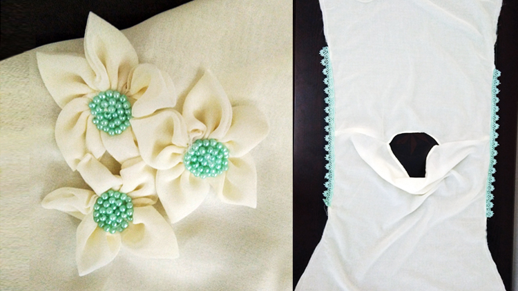 കൗൾ ടോപ്പിന് എലഗൻസ് നൽകുന്ന ഫാബ്രിക് ഫ്ലവേഴ്സിനെയും പരിചയപ്പെടാം. ടോപ്പിന് ചേരുന്ന കോൺട്രാസ്റ്റിൽ ഉള്ളത് അല്ലെങ്കിൽ സെയിം ഷേഡിൽ ഫ്ലവേഴ്സ് ഉണ്ടാക്കാം. ഷുഗർ ബീഡ്സ് അല്ലെങ്കിൽ പേൾസ് ഉപയോഗിച്ച് ഫാബ്രിക് ഫ്ലവേഴ്സിന് അട്രാക്റ്റിവ് ലുക്കും നൽകാം.