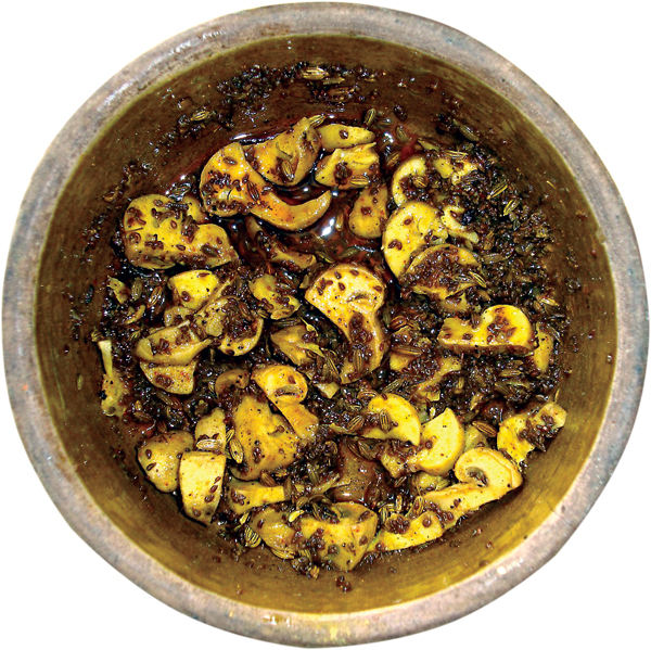 ചീനച്ചട്ടിയില് എണ്ണ ഒഴിച്ച് കടുക് പൊട്ടി കറിവേപ്പില ഇട്ടശേഷം വെളുത്തുള്ളി, ഇഞ്ചി, സവാള, പച്ചമുളക് എന്നിവ ഇട്ട് ഇളക്കിയ ശേഷം ഇതില് കൂണ് ചേര്ത്ത് വഴറ്റുക. അതിനുശേഷം ഉപ്പ്, കുരുമുളക്, മുളകുപൊടി, മഞ്ഞള്, മല്ലിപ്പൊടി എന്നിവ ചേര്ത്ത് ആവശ്യത്തിന് വെള്ളവും ചേര്ത്ത് അടച്ചുവെച്ച് ചെറുതീയില് വേവിക്കുക. വെള്ളം വറ്റി ഫ്രൈ ആക്കി എടുത്ത് ആവശ്യാനുസരണം ഉപയോഗിക്കാം.