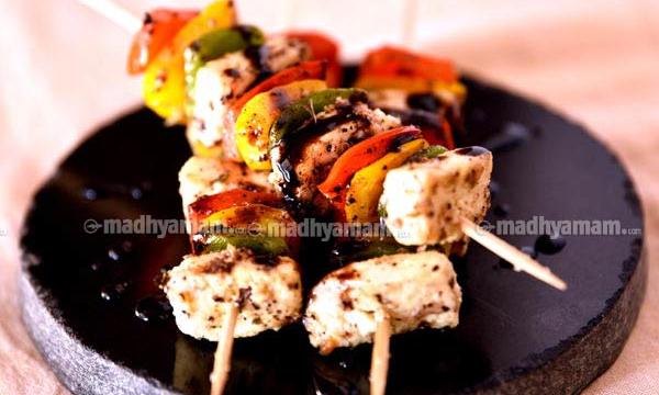 പനീർ ചതുരത്തിൽ മുറിച്ച് മൂന്ന് നിറങ്ങളിലുള്ള കാപ്സിക്കവും ഡ്രൈഡ് ഒറിഗാനോയും ഉപ്പ്, കുരുമുളകുപൊടി, ഒലിവ് ഒായിൽ, നാരങ്ങനീര്, ബാർസനിക് വിനാഗിരി എന്നിവയും ചേർത്ത് മാരിനേറ്റ് ചെയ്യുക. മാരിനേറ്റ് ചെയ്ത പനീറും കാപ്സിക്കവും ഗ്രില്ലിങ് പാൻ അല്ലെങ്കിൽ തവയിൽ എണ്ണയോ ബട്ടറോ ഒഴിച്ച് ഇരുവശവും ഗ്രിൽ ചെയ്തെടുക്കുക.സാത്തെ സ്റ്റിക്കിൽ അത് അറേഞ്ച് ചെയ്യുക. ഒരു പാനിൽ ബാർസനിക് വിനാഗിരി ചൂടാക്കി അതിലേക്ക് പഞ്ചസാര ചേർത്ത് നൂൽ പരിവമാവുമ്പോൾ അതുകൂടെ ഒഴിച്ചാൽ േപ്ലറ്റിങ്ങും ഭംഗിയാകും േഫ്ലവറും ലഭിക്കും.