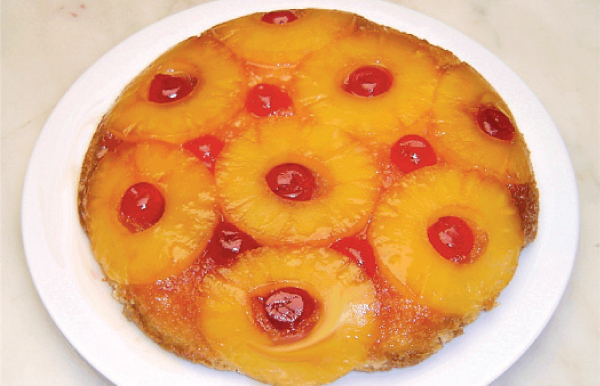 പൈനാപ്പിള് വട്ടത്തില് മുറിച്ച് കൂഞ്ഞ് കളഞ്ഞ് ഓരോന്നിലും ചെറിവെച്ച് നിരത്തണം. പൊടിച്ച പഞ്ചസാരയും വെണ്ണയും കൂടി നന്നായി തേച്ചു യോജിപ്പിക്കുക. ഇതില് മുട്ടയുടെ ഉണ്ണിയിട്ട് തേക്കുക. ബേക്കിങ് പൗഡറും മൈദയും കൂടി അരിച്ചുവെക്കുക. വെണ്ണ തേച്ചതില് മൈദ കുറേശ്ശ യോജിപ്പിക്കുക. രണ്ട് സ്പൂണ് പഞ്ചസാര കരിച്ചത് ഈ കൂട്ടില് ചേര്ത്ത് ഇളക്കിവെക്കുക. മുട്ടയുടെ വെള്ള പതപ്പിച്ചതും ചേര്ത്ത് എസന്സ് പൊടികളും ഇട്ട് ഇളക്കി പൈനാപ്പിളിന്റെ മുകളില് ഒഴിച്ചുനിരത്തുക. പാത്രം ഫോയില് പേപ്പര്കൊണ്ട് മൂടി ചൂടായ ഓവനില്വെച്ച് ബേക്കു ചെയ്തെടുക്കുക.