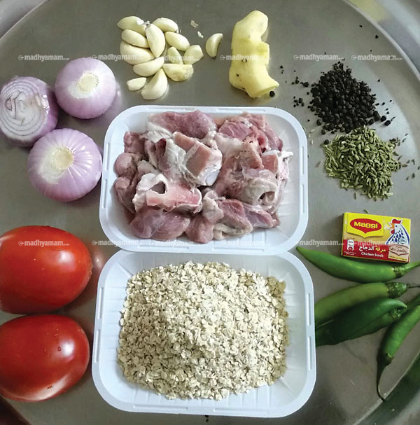 മൂന്ന് വിസിലിനുശേഷം കുക്കർ ഓഫ് ചെയ്തതിനു ശേഷം അടപ്പുതുറന്ന് ഓട്സ് ചേർത്ത് നന്നായി ഇളക്കി വീണ്ടും അടുപ്പിൽവെച്ച് വേവിക്കുക (ഇനി കുക്കറിെൻറ മൂടി ആവശ്യമില്ല). 20 മിനിറ്റോളം വേവിക്കുക. ഇടക്കിടക്ക് ഇളക്കിക്കൊടുക്കണം ഇല്ലെങ്കിൽ അടിയിൽ പിടിക്കാനുള്ള സാധ്യത കൂടുതലാണ്. വിളമ്പുമ്പോൾ മല്ലിയില മുകളിൽ വിതറി വിളമ്പുക.