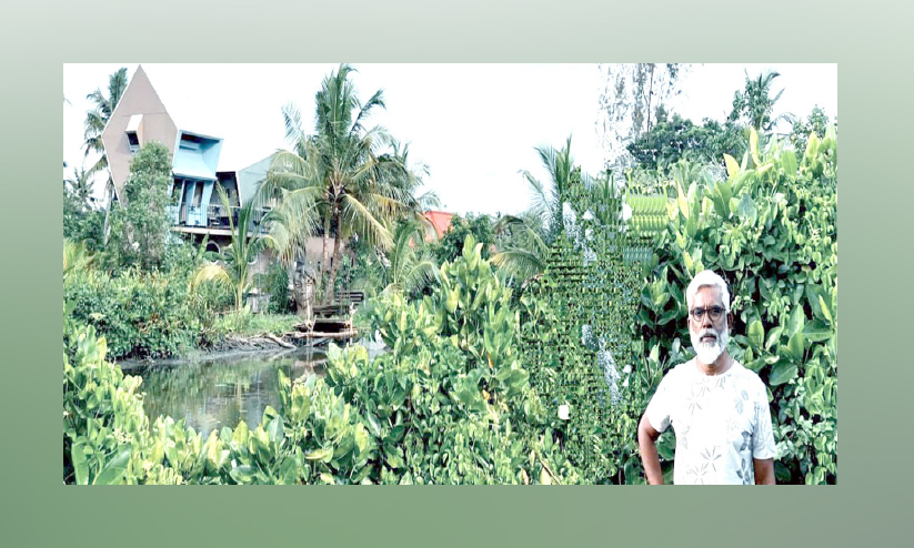 പുരയിടത്തിൽ ഉണ്ടായിരുന്ന കുളം കേന്ദ്രീകരിച്ചാണ് വീടിെൻറ സിറ്റൗട്ട്. ഭൂമിയിൽ കമഴ്ത്തിവെച്ച 10000 ചിരട്ടകൾക്ക് മുകളിലാണ് വീട് ഇരിക്കുന്നത്. വയലുകളും തോടുകളും ചുറ്റിയുള്ള പരിസരം മുഴുവൻ കണ്ടൽക്കാടാണ്.