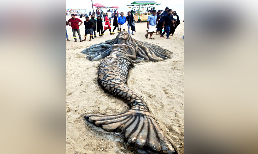 കോഴിക്കോട്: കടൽതീരത്തെ വെളുത്തമണലിൽ മത്സ്യകന്യകയുടെ മനോഹര രൂപം വിരിഞ്ഞു. ബേപ്പൂർ അന്താരാഷ്ട്ര ജലമേളയോടനുബന്ധിച്ച് വയനാട് സ്വദേശിയും ശിൽപിയുമായ ബിനുവും സംഘവുമാണ് മത്സ്യകന്യകയുടെ മനോഹരരൂപം മണലിൽ ചമച്ചത്.