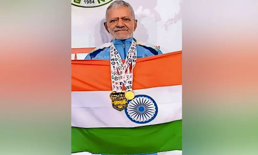 മുട്ടിക്കുളങ്ങര: ഏഷ്യൻ മാസ്റ്റേഴ്സ് പവർലിഫ്റ്റിങ്ങിൽ സുവർണ നേട്ടവുമായി പാലക്കാട് സ്വദേശി. മുട്ടിക്കുളങ്ങര കടമ്പടിപുരയിൽ വേലായുധനെന്ന 71 വയസുകാരനാണ് പ്രായം തളർത്താത്ത പോരാട്ടവീര്യവുമായി ഇന്ത്യക്കായി മെഡൽകൊയ്തത്. തുർക്കിയിലെ ഇസ്തംബുളിൽ നടന്ന മത്സരത്തിൽ 59 കിലോഗ്രാം വിഭാഗത്തിൽ 145 കിലോഗ്രാം ഭാരം ഉയർത്തിയാണ് വേലായുധൻ ഈ ബഹുമതി കൈവരിച്ചത്.