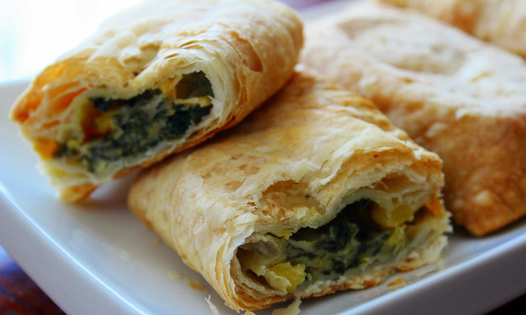 ഓവൻ 200 ഡിഗ്രി ചൂടാക്കിവെക്കുക. സവാള പൊടിയായരിഞ്ഞതും ഉപ്പും ചേർത്ത് നന്നായി വഴറ്റുക. ഇതിലേക്ക് പാലക്ക് ചീര ഇട്ട് വഴറ്റിയ ശേഷം ചീകിയെടുത്ത ചീസ് (grated cheese) ചേർത്ത് നന്നായി യോജിപ്പിക്കുക. മുട്ട ആവശ്യമെങ്കിൽ മാത്രം വേറെ തന്നെ സ്ക്രാമ്പിൾഡ് ചെയ്ത് ഇതിലേക്ക് യോജിപ്പിക്കാവുന്നതാണ്. ശേഷം ഈ മിശ്രിതം പഫ് പേസ്ട്രി ഷീറ്റ് ആവശ്യാനുസരണം ചതുരാകൃതിയിൽ മടക്കുക. വക്കുകൾ നന്നായി മടക്കി ഉറപ്പിക്കുക. ശേഷം, ബ്രഷ് ഉപയോഗിച്ച് ഇതിനുമേൽ ബട്ടർ തടവിവെക്കുക. ഒരു വലിയ ബേക്കിങ് ട്രേയിൽ നിരത്തിവെച്ച് ചൂടാക്കിവെച്ചിരിക്കുന്ന ഓവനിൽവെച്ച് 15 മിനിറ്റ് ബേക്ക് ചെയ്യുക. മുകൾവശം കരുകരുപ്പായി ബ്രൗൺ നിറമായി കഴിയുമ്പോൾ ഓവനിൽ നിന്ന് പുറത്തെടുത്ത് ചൂടാറിയ ശേഷം സോസ് കൂട്ടി കഴിക്കാവുന്നതാണ്.