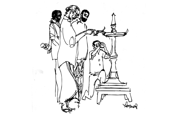 അങ്ങനെയിരിക്കെ, പഴയ കോഴിക്കോടും മാനാഞ്ചിറയും വലിയങ്ങാടിയും പാരഗൺ ഹോട്ടലുമൊക്കെ ചിത്രകാരന്റെ മനസ്സിലെത്തും. നിറവർണങ്ങളുള്ള ഒാർമകൾ. അവിടെ ചിരിതൂകി നിൽപുണ്ട്- വടക്കേ കൂട്ടാല നാരായണൻകുട്ടിനായർ എന്ന വി.കെ.എൻ. വി.കെ.എന്നിന്റെ ‘പിതാമഹൻ’ നോവൽ, സർ ചാത്തു തേരിൽപോകുന്ന ചിത്രമാണ് നമ്പൂതിരി വരക്കേണ്ടത്. രഥമുരുളുന്ന വഴിയിൽ അത്താണി വരച്ചപ്പോൾ നമ്പൂതിരിക്കൊരു കൗതുകം. അത്താണിയിൽ എന്തേലും എഴുത്തുണ്ടേൽ ഭംഗിയല്ലേ... ഏറെ ആലോചിച്ചില്ല. വി.കെ.എന്നിന്റെ കുടുംബപേര് ‘നാണിയമ്മ’ വക എന്ന് വരച്ചിട്ടു. രഥ വഴിയിലെ അത്താണിയും ഉടമയുടെ പേരും കണ്ട വി.കെ.എൻ സന്തോഷം അറിയിച്ചു. വി.കെ.എൻ സുഹൃത്തിന് നൽകിയ സ്വാതന്ത്ര്യമായി കാണുന്നു നമ്പൂതിരി ഇതിനെ. തന്റെ കഥകളിൽ നമ്പൂതിരിക്ക് അദ്ദേഹം എന്നും സ്വന്തമായ ഒരിടം ഒഴിച്ചിട്ടു. സ്വന്തം ആശയങ്ങളും ചേർത്ത് നമ്പൂതിരി അവ പൂരിപ്പിച്ചു. സർ ചാത്തുവും പയ്യനും വെളിച്ചപ്പാടും നങ്ങേമയും ലേഡീഷിറ്റും നമ്പൂതിരിയിലൂടെ തെളിഞ്ഞു. എഴുത്തുകാരനും ചിത്രകാരനും തമ്മിലുള്ള രസതന്ത്രം ഇരുവരെയും ഒറ്റവരയിലാക്കി. ‘അനന്തരം’ എന്ന നോവൽ നമ്പൂതിരിയുടെ വരകാണാൻ മാത്രമാണ് വി.കെ.എൻ എഴുതിയതെന്ന് പറയുന്നു. ‘അനന്തരം’ വി.കെ.എൻ സമർപ്പിച്ചതും നമ്പൂതിരിക്കുതന്നെ ‘വരയുടെ പരമശിവനായ വാസുദേവൻ നമ്പൂതിരിക്ക്’ എന്ന വാക്കിൽ. അഭിമാനിക്കാവുന്ന ആദരം. വി.കെ.എൻ നമ്പൂതിരിക്ക് നിരന്തരം കത്തുകളയച്ചു, തിരിച്ചും. ഒാരോ തവണയും വിലാസത്തിൽവരെ ഹാസ്യം കലർത്തി വി.കെ.എൻ മറുപടി അയച്ചു. കോഴിക്കോട് ബിലാത്തികുളത്ത് നമ്പൂതിരി താമസിക്കുന്ന സമയം, വിലാസത്തിൽ വി.കെ.എൻ ഇങ്ങനെ എഴുതി: ‘നമ്പൂതിരി, ചാക്കോർകുളം തോണ്ടിയതിന് സമീപം’. അവയൊക്കയും നമ്പൂതിരി സൂക്ഷിച്ചുവെച്ചു. ആത്മ കഥയുടെ ഭാഗവുമാക്കി.