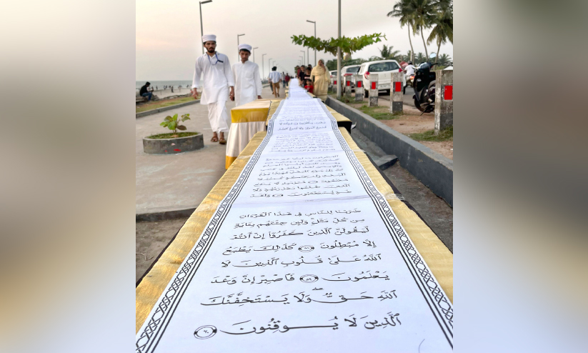 text_fieldsമുഹമ്മദ് ജസീം എഴുതിയ ലോകത്തെ ഏറ്റവും നീളമുള്ള ഖുർആൻ പ്രതിയുടെ സൗത്ത് ബീച്ചിൽ നടന്ന പ്രദർശനം