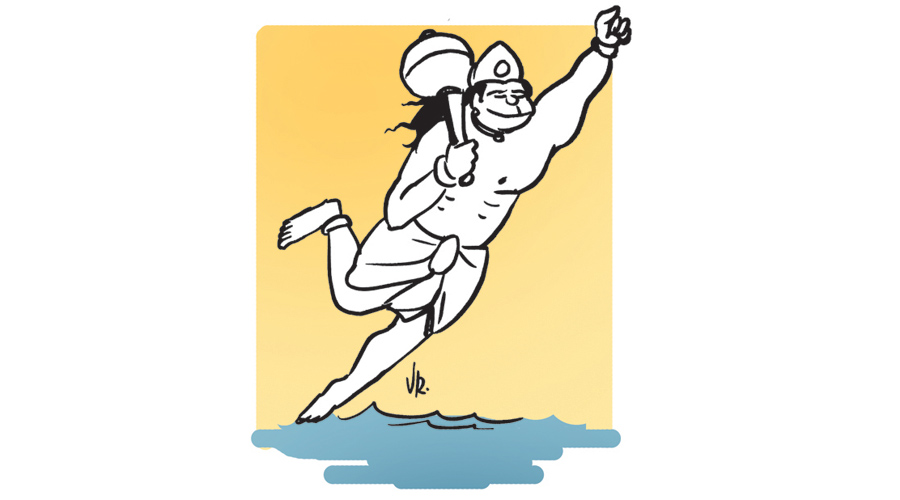 കടൽ ചാടാൻ ആർക്ക് കഴിയും എന്ന് കണ്ടുപിടിക്കാൻ വാനരന്മാർ ഗൗരവപൂർവം കൂടി ആലോചിക്കുമ്പോൾ ഒന്നും മിണ്ടാതെ മാറി ഇരിക്കയായിരുന്നു ഹനുമാൻ. ആ അത്ഭുതജന്മത്തിന്റെ എല്ലാ കഴിവുകളും അറിയാവുന്ന കാരണവരായ ജാംബവാന് ഈ പരിമിതിയും അറിയാം. അദ്ദേഹം ഹനുമാൻ പണ്ടു ചെയ്ത സാഹസിക കൃത്യങ്ങൾ എണ്ണിപ്പറഞ്ഞ് ഓർമിപ്പിക്കുന്നു. പിന്നെ നാം കാണുന്നത് ചിതൽ പുറ്റിൽനിന്ന് ഹിമാലയപ്രായത്തിലേക്കുള്ള ഹനൂമാന്റെ തൽക്ഷണ വളർച്ചയാണ്.