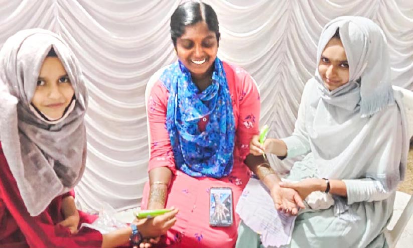 കുട്ടനാട് ചമ്പക്കുളം നടുഭാഗം കൊല്ലശ്ശേരി വീട്ടിൽ ആനന്ദൻ-വിപിന ദമ്പതികളുടെ മകൾ ലക്ഷ്മിയുടെ ഞായറാഴ്ച നടക്കുന്ന വിവാഹത്തിന് മുന്നോടിയായി കല്യാണപ്പെണ്ണിന് മൈലാഞ്ചിയിടാൻ എത്തിയത് അപരിചിതരായ രണ്ട് പെൺകുട്ടികളാണ് -നീർക്കുന്നം ഇല്ലത്തുപറമ്പിൽ സിറാജിെൻറ മകൾ നിദ ഫാത്തിമയും സഹോദരൻ കാക്കാഴം മാമ്പലയിൽ സെയ്തിെൻറ മകൾ ഹന നസ്റിനും.