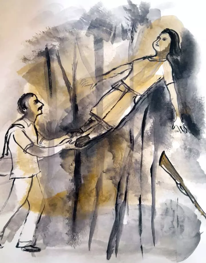 മുകള്ത്തട്ടിലേക്കുള്ള അവസാന പടിയിലെത്തിയപ്പോള് നെറ്റിയില് ഒരു തണുപ്പ്. അവനൊന്ന് ഞെട്ടി. ഇരട്ടക്കുഴല് തോക്കിന്റെ അഗ്രം അവന്റെ നെറ്റിയില് മുട്ടിനില്ക്കുന്നു. അവന് തോക്കിന്റെ അങ്ങേത്തലയിലേക്ക് നോക്കി. ഒരു സ്ത്രീ!