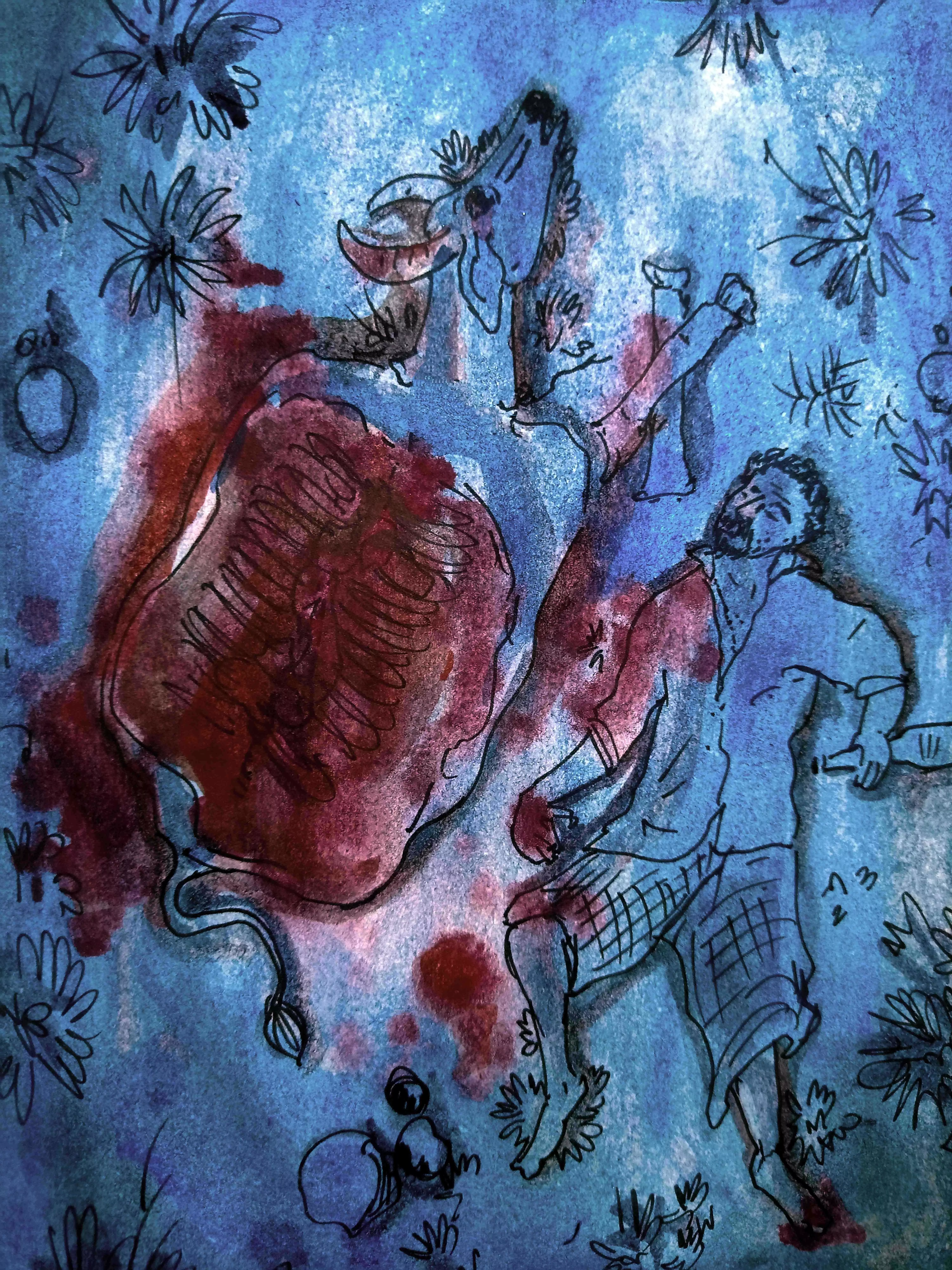 വായില്ത്തടഞ്ഞ ഗുഹ്യഭാഗത്തെറിയത്രയും വിളിച്ചു പറഞ്ഞ് തങ്കൻ, ഛർദിയെ അതിജീവിച്ചു. പോത്തുംചോരയിൽ ചവിട്ടിത്തെന്നി ഛർദിയിൽ മുങ്ങി പോത്തിൻ വാരിക്കൂടിനുള്ളിൽ അമരൻ വീണുകിടന്നു. ചോരയിലും ഛർദിയിലും കുതിർന്നു കിടന്ന അവനെ പൊക്കിയെടുത്ത് കപ്പക്കാലായിലെ മണ്ണാങ്കട്ടകൾക്ക് മുകളിൽ കുത്തിയിരുത്തിയിട്ട്, ചൂടൻ തങ്കൻ ഒരു കട്ടൻ ബീഡി കത്തിച്ചു. രക്തക്കട്ടകൊണ്ട് വെട്ടിയുണ്ടാക്കിയ മൂന്നു ചുവന്ന രൂപങ്ങളായി നാട്ടുവെളിച്ചത്തില് അവർ തിളങ്ങുന്നുണ്ടായിരുന്നു. പുളിപ്പും ചവർപ്പും കലർന്ന വാറ്റ് തപ്പിയെടുത്തു. വിരൽ മുക്കി നനച്ച് തീപ്പെട്ടിക്കൊള്ളിയുരച്ച് കത്തിച്ചെങ്കിലും വലിയ ശേഷിയില്ലാതെ പുളിച്ചു കത്തിയതേയുള്ളൂ.
