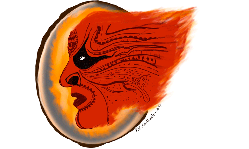 നേർത്ത ഇരുട്ടിൽ അവ്യക്തമായി പോയ മുഖങ്ങളിൽ തിളങ്ങുന്ന മിഴിയിണകൾ മാത്രം കാണം. നോക്കിയാൽ കണ്ണ് ചൂഴ്ന്നെടുക്കുന്ന കാലമാണ്. രാത്രിയുടെ നിശബ്ദതയിൽ ചെണ്ടമേളം ഉയർന്നത് പെട്ടന്നാണ്. ജ്വലിക്കുന്ന ചൂട്ടുകൾ ഉയർത്തി ആകാശം നോക്കി നിന്ന മാതന്റെ സിരാ പടങ്ങളിലേക്ക് ദൈവത്താന്റെ സന്നിവേശമുണ്ടായി. അയാൾ നിന്നു വിറച്ചു, മുരണ്ടു. മുറുകിയ വാദ്യങ്ങൾക്കൊപ്പം അയാൾ ചടുലമായി ഉറഞ്ഞു തുള്ളി.
