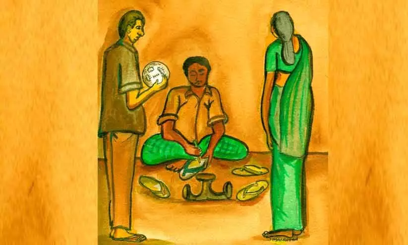 തുന്നിയ ചെരിപ്പുമായി സ്ത്രീ പോയതോടെ മുരുകണ്ണൻ സൈനുലിൽനിന്ന് പന്ത് വാങ്ങി, പന്തിന് ചുറ്റും താൻ മുമ്പ് നടത്തിയ ശസ്ത്രക്രിയ കണ്ട് ഉള്ളാലെ ചിരിച്ചു. ‘‘അടുത്ത ദിവസം പുതിയ പന്ത് വാങ്ങുന്നുണ്ട്. പിരിവെടുത്തു കഴിഞ്ഞു.’’ മുരുകന്റെ ഭാവം കണ്ടിട്ടാവണം, സൈനുൽ മുൻകൂർ ജാമ്യമെടുത്തത്. അയാൾ ബോളിലെ ഉള്ളിലെ കുഞ്ഞിന് പോറലേൽക്കാതെ ശ്രദ്ധയോടെ തുന്നാൻ തുടങ്ങി. സൈനുലും അടുത്തിരുന്നു