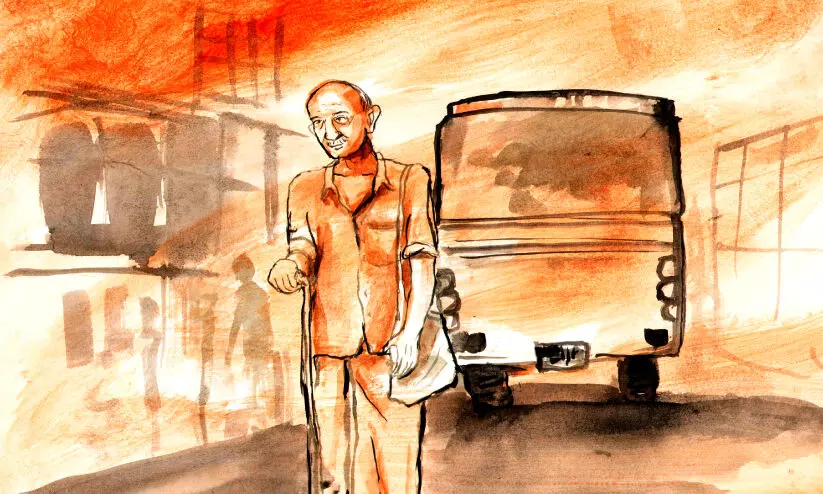 ബസിറങ്ങിയപ്പോഴാണ് ഒരു ഞൊടിയിൽ ദേഹം തളരുന്നപോലെ അയാൾക്ക് തോന്നിയത്. കണ്ണടയിൽ നനവു പടർന്നപോലെ, കാഴ്ച പൊടുന്നനെ മൂടിപ്പോയി. അവസാനത്തെ ചവിട്ടുപടി വരെ എല്ലാം സുവ്യക്തമായിരുന്നു. മണ്ണിലേക്ക് കാലെടുത്തുവെക്കാൻ തുടങ്ങുമ്പോഴാണ് അത് സംഭവിച്ചത്. ഊന്നുവടിയിൽ ഇരു കൈകളും താങ്ങി, വീഴാതിരിക്കാൻ ശ്രദ്ധിച്ച് അയാൾ ഒരുമാത്ര അവിടെത്തന്നെ നിന്നു. ബസിന്റെ വാതിലടക്കുമ്പോൾ...