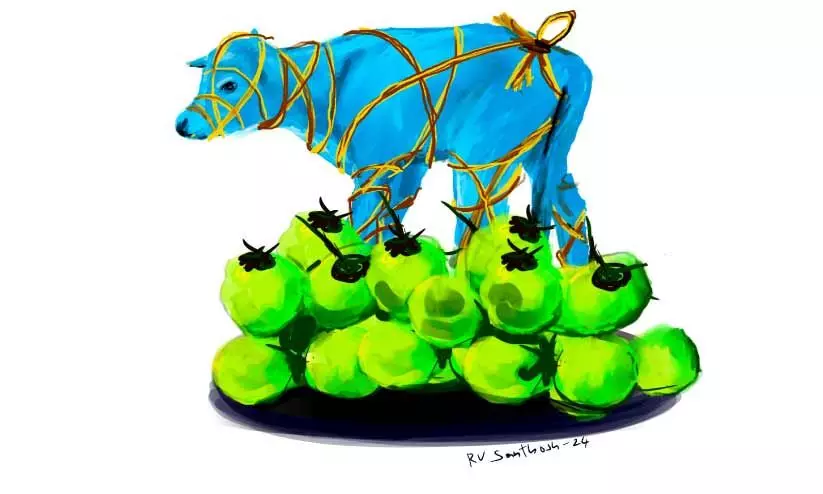 മോ എന്തോ? തേങ്ങായായില്ലിയോ മനുഷ്യാ എന്ന് ദീനാമ്മ ദേഷ്യപ്പെട്ടന്വേഷിക്കുന്നുണ്ടായിരുന്നു. സ്വന്തം കയറിൽ ആ പശുക്കുട്ടി മരണവെപ്രാളം കാണിക്കുന്നത് ഒന്നുരണ്ട് വട്ടം ശ്രദ്ധയിൽപ്പെട്ടു. വല്ലവരുടെയും പറമ്പ്; ആരുടെയോ പശുക്കുട്ടി. മരണവെപ്രാളം ഉൾപ്പെടെ ഒന്നിന്റെയും അഗാധതലങ്ങൾ തിരയാൻ പറ്റിയ മാനസികാവസ്ഥയിലായിരുന്നില്ല ഞാൻ. ഉണക്ക തേങ്ങയാണെങ്കിൽ പൊളിഞ്ഞുവരുന്നുമില്ല. എന്തിനെയും അതിന്റെ കേവലമായ അവസ്ഥയിൽ വിലയിരുത്താനും കണ്ടെത്താനുമാണ് ഞാൻ ശ്രമിക്കാറുള്ളത്. സ്വന്തം നാളികേരമാണോ അന്യന്റെ പറമ്പിലെ മറ്റൊരന്യന്റെ പശുക്കുട്ടിയാണോ പരമപ്രധാനം എന്ന ചോദ്യമുയർന്നപ്പോഴൊക്കെ സ്വന്തം നാളികേരത്തിന്റെ ചിരട്ട കൃത്യമായ അളവിൽ പൊട്ടിച്ചെടുക്കാനാണ് ഞാൻ ശ്രമിച്ചത്. അതൊരു പേട്ടുതേങ്ങയായിരുന്നില്ല. എലിമൂത്രംപോലെ കുറച്ചു വെള്ളം; വാട്ടവെള്ളം; കുടിക്കാൻ തോന്നിയില്ല. ദീനാമ്മ തേങ്ങ ചുരണ്ടാൻ തുടങ്ങി.