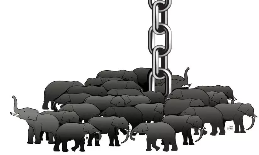 അങ്ങനെ ആ ദിവസം വന്നു. പെട്ടെന്ന് നഗരത്തിലെ പല ഭാഗങ്ങളിൽനിന്ന് യാതൊരു കൂസലുമില്ലാതെ ആനകൾ നടന്നടുത്തു. നഗരം തലപ്രാന്ത് പിടിച്ച് ഓടി. തള്ളിയും തുമ്പിക്കൈ ചുറ്റിയും ആനക്കൂട്ടം ഒരു ആംബുലൻസ് പുറത്തേക്കെടുത്തു. നിലപ്പൊക്കങ്ങളിലെ ജനാലകളിൽനിന്നും ടെറസ്സുകളിൽനിന്നും സി.സി.ടി.വി കാമറകൾ വഴിയും ആക്ഷൻ ചിത്രീകരിക്കപ്പെട്ടു. എടുത്തു പൊക്കിയ ആംബുലൻസ് ഒരു പൊലീസ് സ്റ്റേഷന്റെ മുന്നിൽ കൊണ്ടുപോയങ്ങ് വെച്ചശേഷം കുത്തിയും തുമ്പിക്കൈക്കടിച്ചും പൊളിക്കാൻ തുടങ്ങി. പ്രത്യേകമായുണ്ടാക്കിയ അറകളിൽനിന്നും പാക്കറ്റുകൾ ചിതറിവീണു. ആനകൾ പിരിഞ്ഞു എന്നുറപ്പായ ശേഷമാണ് പൊലീസും കാമറകളും പാക്കറ്റുകൾക്ക് ചുറ്റും കൂടിയത്. “നിരോധിതം സാറേ... നിരോധിതം” –എസ്.പി അതിനും മുകളിലേക്ക് വിളിച്ചുപറഞ്ഞു.