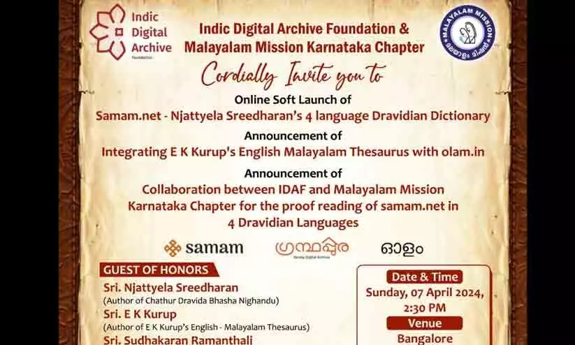 ഇ.കെ. കുറുപ്പിന്റെ തിസോറസിനെ ഓളം ഓൺലൈൻ ഡിക്ഷനറിയിലേക്ക് ചേർക്കുന്നതിന്റെ പ്രഖ്യാപനവും ‘സമം’ ചതുർ ദ്രാവിഡഭാഷാ ഓൺലൈൻ നിഘണ്ടുവിന്റെ നാലു ഭാഷകളിലുള്ള ഉള്ളടക്കം പ്രൂഫ് റീഡ് ചെയ്യുവാൻ ഇൻഡിക് ഡിജിറ്റൽ ആർകൈവ് ഫൗണ്ടേഷനും മലയാളം മിഷൻ കർണ്ണാടക ചാപ്റ്ററും ചേർന്നുള്ള സംയുക്ത ബൃഹത് പദ്ധതിയുടെ പ്രഖ്യാപനവും നടക്കും.