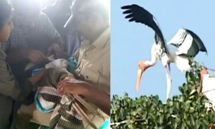 1. ബെല്ലൂർ പക്ഷി സങ്കേതത്തിൽ പെലിക്കണിന്റെ ചിറകിൽ ജി.പി.എസ് ഘടിപ്പിക്കുന്നു 2. പക്ഷി സങ്കേതത്തിലെത്തിയ പെലിക്കൺ