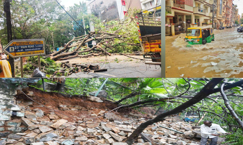 text_fields1. മഴയിൽ ജയനഗറിൽ കടപുഴകിയ മരം മുറിച്ചുമാറ്റുന്നു 2. കനത്ത മഴയിൽ ഹരിഹര പാർക്കിന്റെ ചുറ്റുമതിൽ തകർന്നുവീണപ്പോൾ 3. തിങ്കളാഴ്ച പുലർച്ചെ പെയ്ത കനത്ത മഴയിൽ ഈജിപുരയിൽ വെള്ളക്കെട്ടുയർന്നപ്പോൾ
