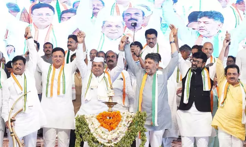 text_fieldsമൈസൂരു മഹാരാജാസ് കോളജ് മൈതാനത്ത് വെള്ളിയാഴ്ച കോൺഗ്രസ് സംഘടിപ്പിച്ച ജനാന്ദോളന കൺവെൻഷനിൽ മന്ത്രി എച്ച്.സി. മഹാദേവപ്പ, എ.ഐ.സി.സി ജനറൽ സെക്രട്ടറി രൺദീപ് സിങ് സുർജെ വാല, മുഖ്യമന്ത്രി സിദ്ധരാമയ്യ, ഉപമുഖ്യമന്ത്രിയും കെ.പി.സി.സി അധ്യക്ഷനുമായ ഡി.കെ. ശിവകുമാർ, ബി.ഡി.എ ചെയർമാൻ എൻ.എ. ഹാരിസ് എം.എൽ.എ, മന്ത്രി സമീർ അഹമ്മദ് ഖാൻ തുടങ്ങിയവർ അണികളെ അഭിവാദ്യം ചെയ്യുന്നു