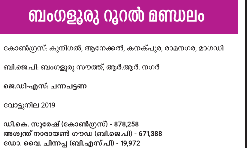 കോൺഗ്രസിന് വിജയമുറപ്പുള്ള മണ്ഡലങ്ങളിലൊന്നാണ് ബംഗളൂരു റൂറൽ. പഴയ കനകപുര ലോക്സഭ മണ്ഡലമാണ് 2008ലെ മണ്ഡല പുനർനിർണയത്തിന് ശേഷം ബംഗളൂരു റൂറലായി മാറിയത്. മണ്ഡല പുനർനിർണയത്തിന് മുമ്പും ശേഷവും കോൺഗ്രസിന് അനുകൂലമായ മണ്ണാണ് ഇവിടത്തേത്. ജെ.ഡി.എസ് അധ്യക്ഷനായ എച്ച്.ഡി. ദേവഗൗഡയും മകൻ എച്ച്.ഡി. കുമാരസ്വാമിയും പഴയ കനക്പുര മണ്ഡലത്തിൽ നിന്ന് വിജയിച്ചിട്ടുണ്ട്. 2002ൽ നടന്ന ഉപതെരഞ്ഞെടുപ്പിൽ ശ്രദ്ധേയമായ പോരാട്ടത്തിൽ ദേവഗൗഡ അര ലക്ഷത്തിലേറെ വോട്ടിന് ഡി.കെ. ശിവകുമാറിനെയാണ് തോൽപിച്ചത്. അന്ന് മൂന്നാം സ്ഥാനത്തെത്തിയത് ബി.ജെ.പി നേതാവ് കെ.എസ്. ഇൗശ്വരപ്പയായിരുന്നു. മണ്ഡല പുനർനിർണയത്തിന് ശേഷം 2009ൽ നടന്ന തെരഞ്ഞെടുപ്പിൽ കുമാരസ്വാമി ബി.ജെ.പിയുടെ സി.പി. യോഗേശ്വറിനെ തോൽപിച്ചപ്പോൾ കോൺഗ്രസിന്റെ തേജസ്വിനി ഗൗഡ മൂന്നാമതായി.