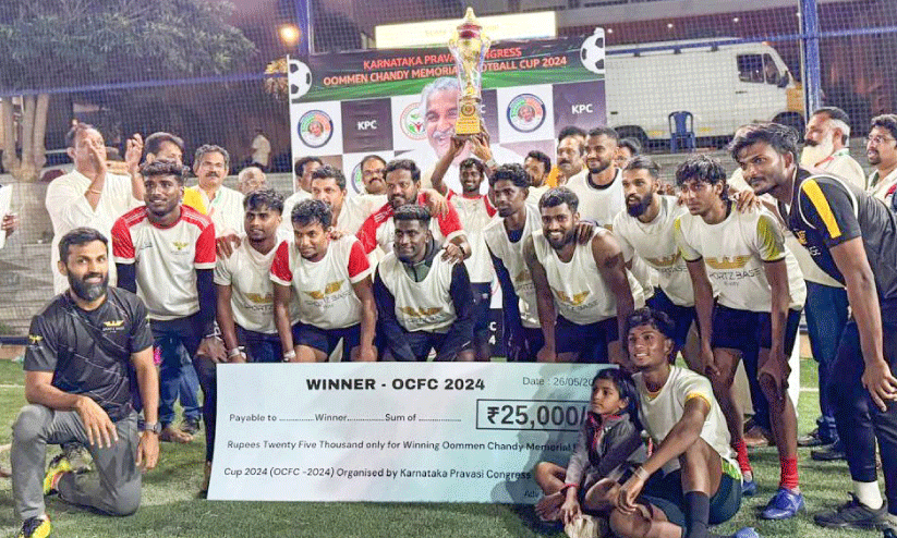 ബംഗളൂരു: 16 ടീമുകൾ മാറ്റുരച്ച ഉമ്മൻ ചാണ്ടി മെമ്മോറിയൽ ഫുട്ബാൾ ചാമ്പ്യൻഷിപ് മത്സരത്തിൽ അക്വാറിസ്റ്റ് പൂൾസ് എഫ്.സിയും സ്പോർട്സ് ബേസ് ഇ സിറ്റിയും തമ്മിലുള്ള ഫൈനൽ മത്സരത്തിൽ ഏകപക്ഷീയ ഗോളിന് അക്വാറിസ്റ്റ് വിജയികളായി ഒന്നാം സമ്മാനമായ കാൽ ലക്ഷം രൂപയും ഉമ്മൻ ചാണ്ടി മെമ്മോറിയൽ ട്രോഫിയും കരസ്ഥമാക്കി.