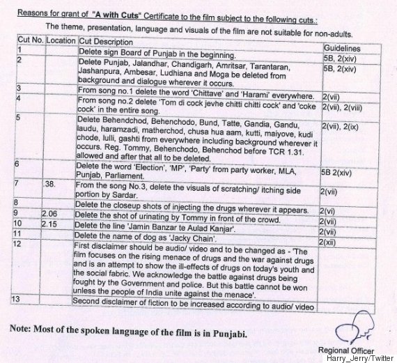ഉഡ്ത പഞ്ചാബിൽ സെൻസർ ബോർഡ് മുറിച്ചുമാറ്റാൻ ആവശ്യപ്പെട്ട 94 ഭാഗങ്ങൾ