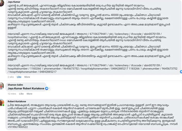 ‘എന്റെ പേര് ജയകുമാർ, എറണാകുളം ജില്ലയിലെ കോലഞ്ചേരിയിൽ ഒരു ചെറിയ മുറിയിൽ ആണ് താമസം. എന്റെ രണ്ടു കിഡ്നിയും തകരാറിലാണ്....’ എന്നിങ്ങനെ തുടങ്ങുന്ന കുറിപ്പിൽ ചികിത്സിക്കുന്ന ഡോക്ടറെക്കുറിച്ചും ആശുപത്രിയെക്കുറിച്ചുമുള്ള വിവരങ്ങളെല്ലാം ഉണ്ടായിരുന്നു.