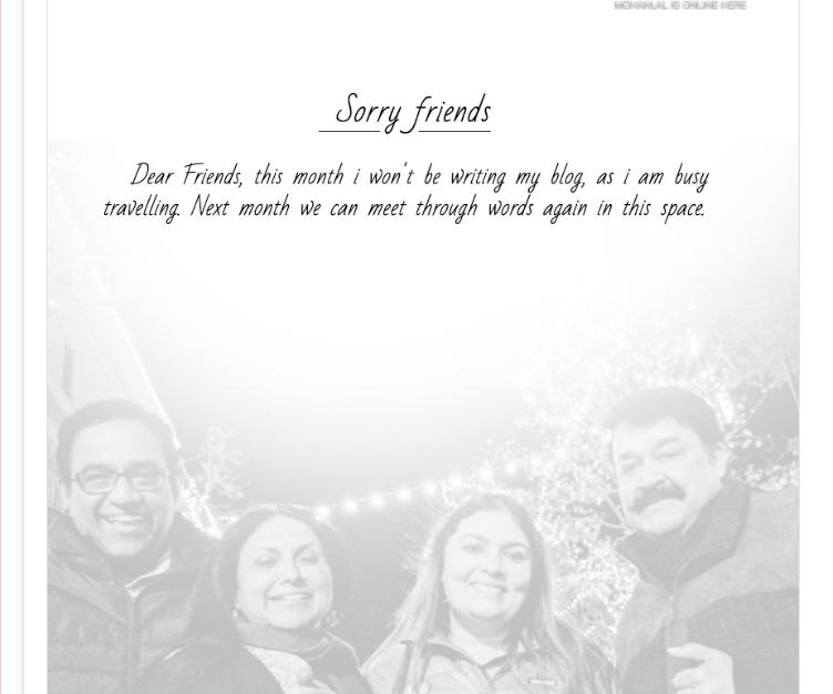 date_range 22 Dec 2016 6:05 AM ISTയാത്രയിലായതിനാൽ ഈ മാസം ബ്ലോഗെഴുതുന്നില്ല -മോഹൻലാൽ