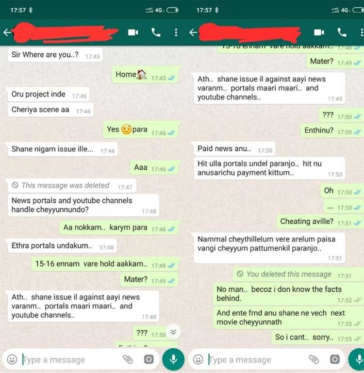 കഴിഞ്ഞ പാർലിമെന്റ് തിരെഞ്ഞെടുപ്പിൽ നാലഞ്ചു സ്ഥാനാർത്ഥികൾക്ക് വേണ്ടി ഡിജിറ്റൽ മീഡിയ പ്രവർത്തനങ്ങൾ ഏകോപിക്കുന്നതിനും നേതൃത്വം നൽകുന്നതിനും അവസരം ലഭിച്ചിരുന്നു. അന്നത്തെ ബന്ധത്തിൽ നിന്നും രണ്ടു ദിവസം മുന്നേ ഒരു മെസ്സേജ് വരികയുണ്ടായി. ഷെയിൻ നിഗം ആണ് വിഷയം. ന്യൂസ് പോർട്ടൽസ്, യൂട്യൂബ് ചാനൽ എന്നിവ ഉണ്ടോ? ഹിറ്റ് നു അനുസരിച്ചു പേയ്മെന്റ് കിട്ടും, ഷെയിൻ നിഗത്തിനു എതിരെ പോസ്റ്സ്, സ്റ്റോറീസ് വരണം. അതായത് "പൈഡ് ന്യൂസ് "..