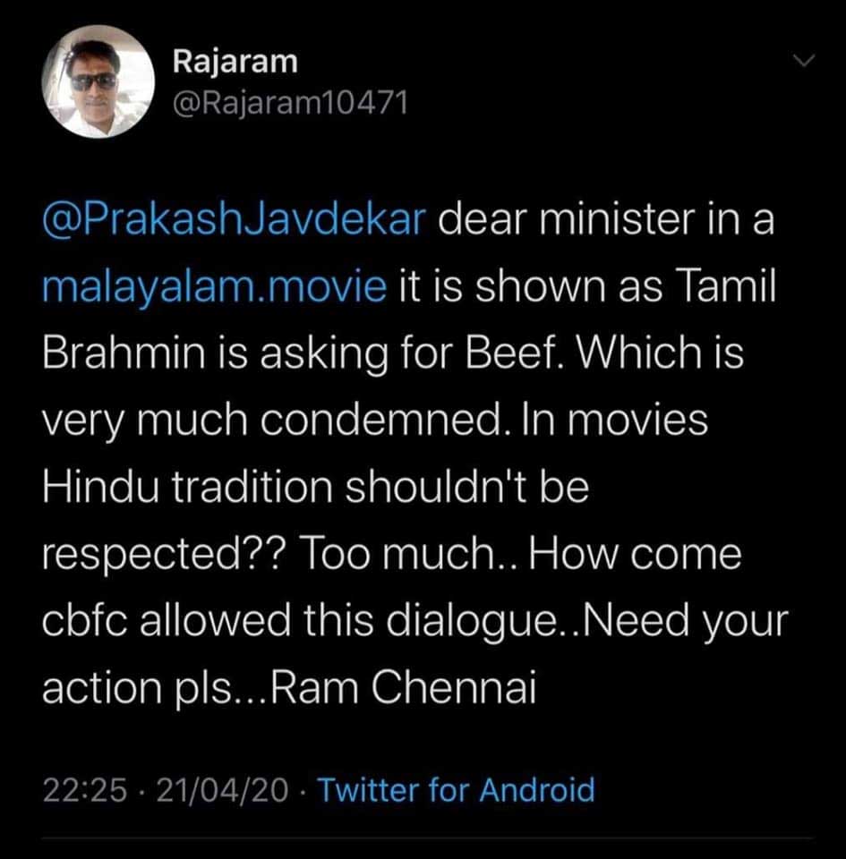 പുതിയ വിവാദം ഒരു രംഗത്തെ ചൂണ്ടിക്കാട്ടിയാണ്. ദുൽഖറിെൻറ കഥാപാത്രത്തോട് ഒരു തമിഴ് ബ്രാഹ്മണൻ ഭാര്യ കാണാതെ രഹസ്യമായി ബീഫ് നൽകണമെന്ന് ആവശ്യപ്പെടുന്ന രംഗമുണ്ട്. ആ രംഗം ഹിന്ദുക്കളുടെ വികാരം വൃണപ്പെടുത്തുന്നതാണെന്നാണ് ആരോപണം. "ഹിന്ദുക്കളുടെ പാരമ്പര്യം ബഹുമാനം അർഹിക്കുന്നില്ലേ..? സെൻസർ ബോർഡ് എങ്ങനെയാണ് ഇത്തരം ഡയലോഗുകൾ അംഗീകരിച്ചത്? " തുടങ്ങിയ ചോദ്യങ്ങളാണ് വിമർശകർ ഉന്നയിക്കുന്നത്.