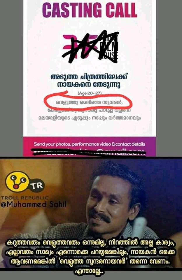 text_fieldsപുതിയ ചിത്രത്തിലേക്ക് നായകരെ തേടിയുള്ള ഫ്രൈഡേ ഫിലിംസിന്റെ പരസ്യം വിവാദമായിരുന്നു. വെളുത്ത് സുന്ദരനായ നായകനെ തേടുന്നുവെന്ന പരസ്യവാചകമാണ് വിമർശനത്തിന് കാരണം. കറുത്തവർ സുന്ദരൻമാരല്ലേയെന്ന് ചോദിച്ച് പോസ്റ്റിന് താഴെ നിരവധി പേരാണ് വന്നത്.