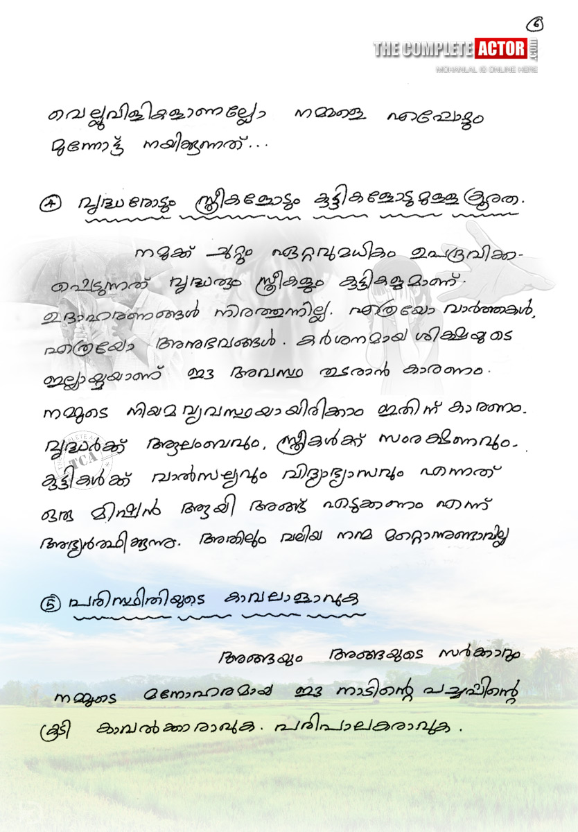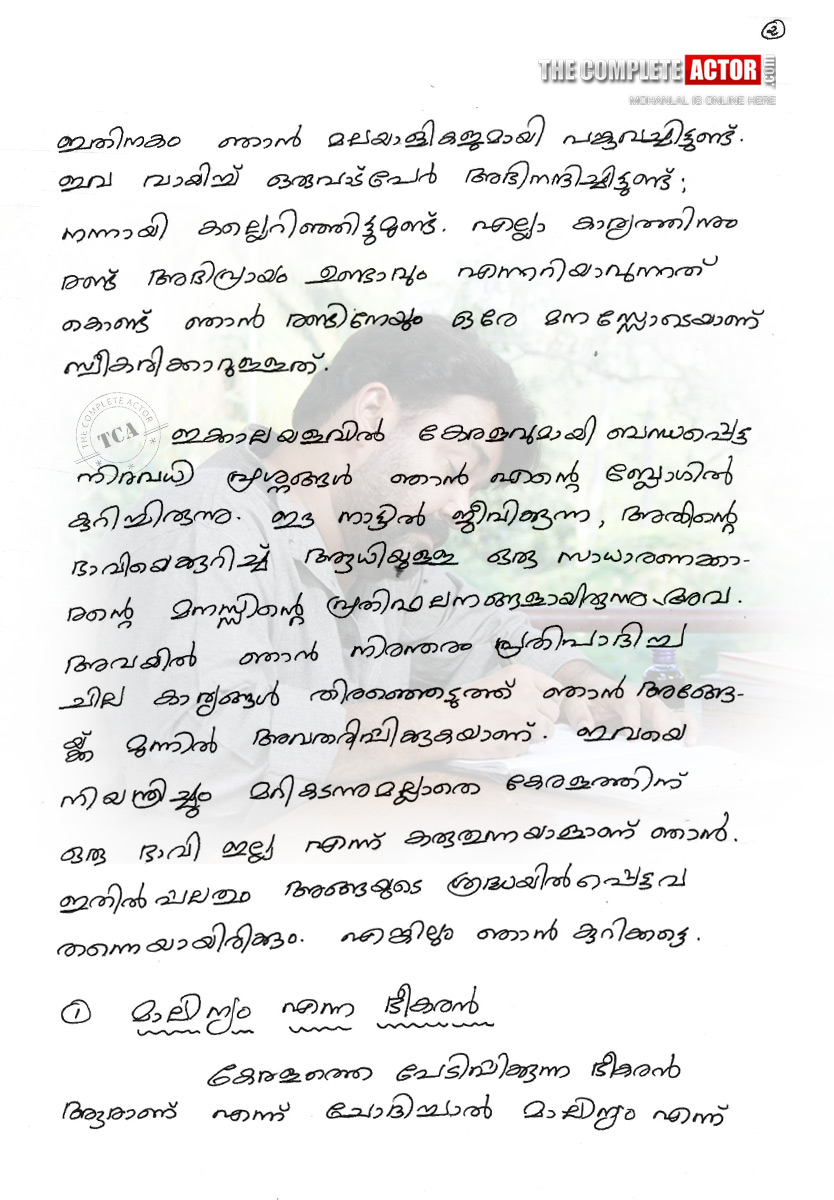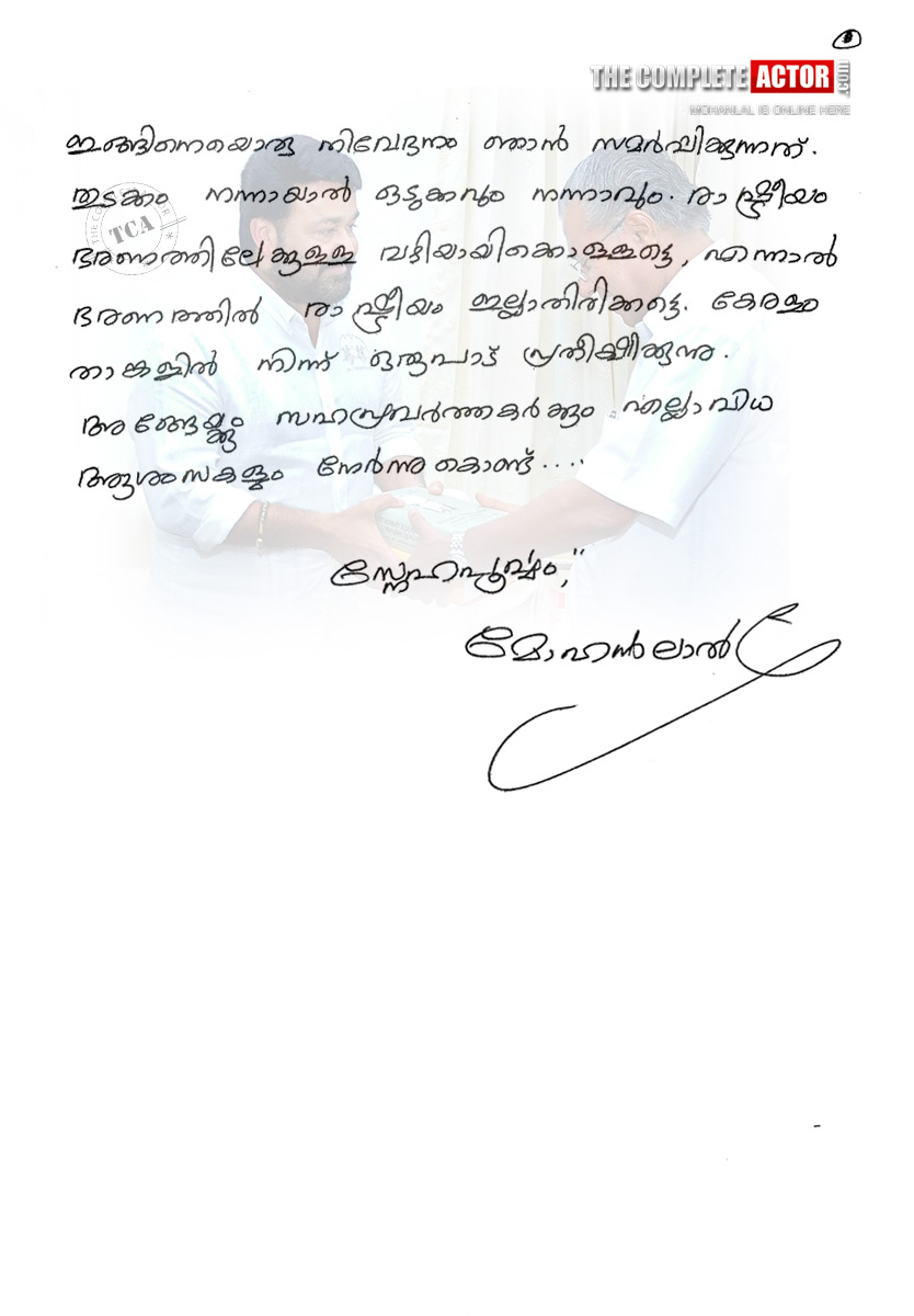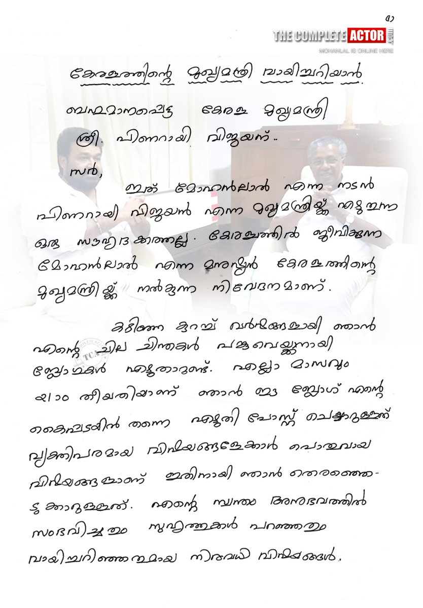 മോഹന്ലാല് എന്ന നടന് മുഖ്യമന്ത്രിക്കെഴുതുന്ന സൗഹൃദ കത്തല്ല, കേരളത്തില് ജീവിക്കുന്ന മോഹന്ലാല് എന്ന മനുഷ്യന് കേരളത്തിന്െറ മുഖ്യമന്ത്രിക്ക് എഴുതുന്ന നിവേദനമാണ് എന്ന മുഖവുരയോടെയുള്ള കത്ത് അഞ്ചുകാര്യങ്ങളാണ് അക്കമിട്ട് നിരത്തുന്നത്.