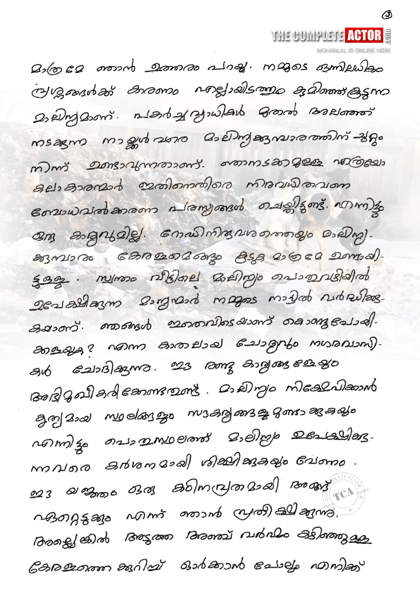 മാലിന്യത്തിന്െറ വ്യാപനം ഭയാനകമായിരിക്കുകയാണെന്ന് കത്തില് ലാല് ചൂണ്ടിക്കാട്ടുന്നു. മാലിന്യം എന്തുചെയ്യണമെന്നറിയാതെ അങ്കലാപ്പിലാണെന്നും ഏതാനും വര്ഷം കഴിഞ്ഞാല് പ്രശ്നം അതിരൂക്ഷമാകുമെന്നും ലാല് പറയുന്നു.