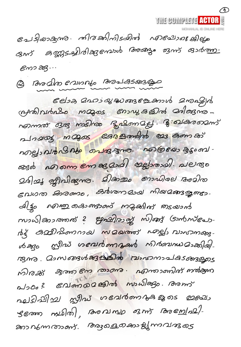 ഋഷിരാജ് സിങ് ട്രാന്സ്പോര്ട്ട് കമീഷണറായിരുന്നപ്പോള് വാഹനങ്ങള്ക്ക് വേഗപ്പൂട്ട് ഘടിപ്പിച്ചിരുന്നതിനാല് അപകടങ്ങള് കുറഞ്ഞിരുന്നു. ഇപ്പോള് നിയമം കാറ്റില് പറത്തി പരക്കംപായുന്ന വാഹനങ്ങള് റോഡില് മരണപരമ്പര സൃഷ്ടിക്കുകയാണ്. ചോരവീഴാത്ത റോഡുകള് നമുക്കുണ്ടാവണം.