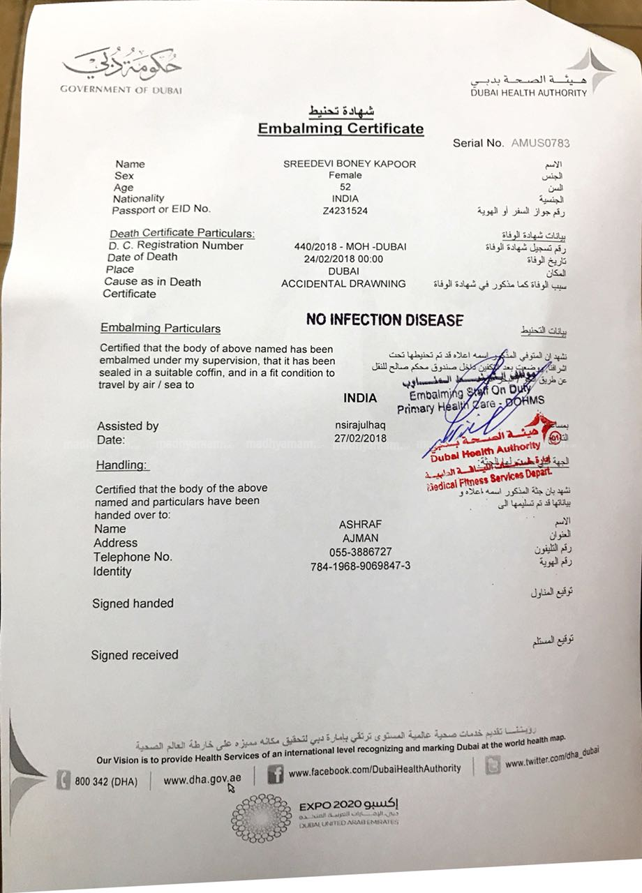 ശ്രീദേവിയുടേത് മുങ്ങിമരണമാണെന്ന് രേഖപ്പെടുത്തി കഴിഞ്ഞ ദിവസം ഡെത്ത് സർട്ടിഫിക്കറ്റ് നൽകിയിരുന്നു. പ്രൊസിക്യൂട്ടറുടെ അനുമതി ഒഴികെയുള്ള എല്ലാവിധ ക്ലിയൻസുകളും നേരത്തെ ശരിയാക്കിയിരുന്നു. റാസൽഖൈമയിൽ ബന്ധുവിെൻറ വിവാഹാഘോഷങ്ങളിൽ പെങ്കടുക്കാനെത്തിയ ശ്രീദേവിയെ ശനിയാഴ്ച രാത്രി ഹോട്ടൽ മുറിയിൽ ബാത്ത് ടബ്ബിൽ ചലനമറ്റനിലയിൽ കണ്ടെത്തുകയായിരുന്നു.
