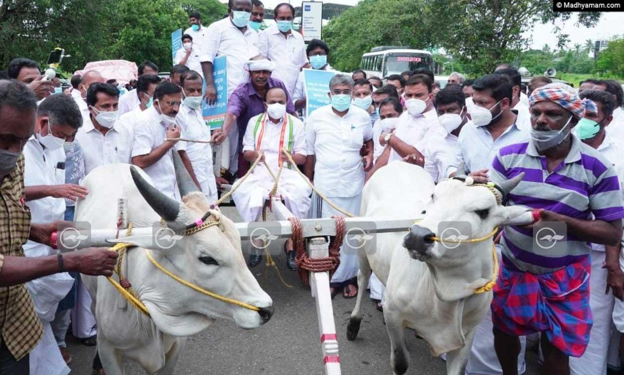 ഇന്ധനവിലവർധനയിൽ പ്രതിഷേധിച്ച് പ്രതിപക്ഷ നേതാവ് വി.ഡി.സതീശൻ്റെ നേതൃത്വത്തിൽ യു.ഡി.എഫ് പ്രവർത്തകർ കൊച്ചിയിൽ കാളവണ്ടിയിൽ യാത്ര ചെയ്ത് പ്രതിഷേധിക്കുന്നു. സൈക്കിളിലായി നൂറുകണക്കിന് പ്രവർത്തകർ പങ്കെടുത്തു