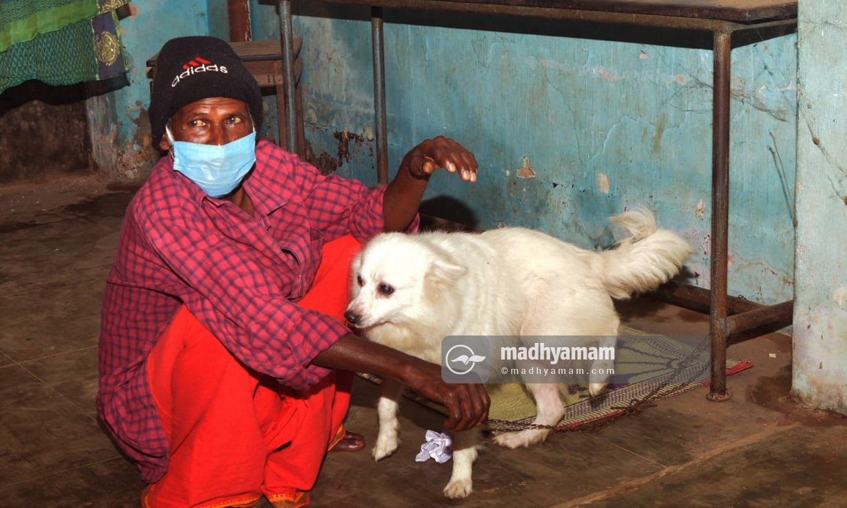 പ്രളയക്കെടുതിയെ തുടർന്ന് ചേർപ്പ് സി.എൻ.എൻ സ്കൂളിലൊരുക്കിയ ദുരിതാശ്വാസ ക്യാമ്പിലെ അന്തേവാസിയായ തിലകനും വളർത്തുനായ റാണിയും. ഫോട്ടോ: ജോൺസൺ വി. ചിറയത്ത്