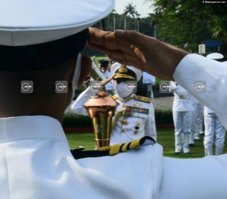 1971 യുദ്ധത്തിന്റെ അമ്പതാം വാർഷികം 'സ്വർണിം വിജയ് വർഷ്' ആഘോഷങ്ങളുടെ ഭാഗമായി പ്രധാനമന്ത്രി തെളിയിച്ച ദീപശിഖാ കൊച്ചി നേവൽ ബേസിൽ നിന്നും തിരുവനന്തപുരത്തേക്ക് പ്രയാണം തുടങ്ങും മുമ്പ് വൈസ് അഡ്മിറൽ എ.കെ ചൗള സല്യൂട്ട് ചെയ്യുന്നു