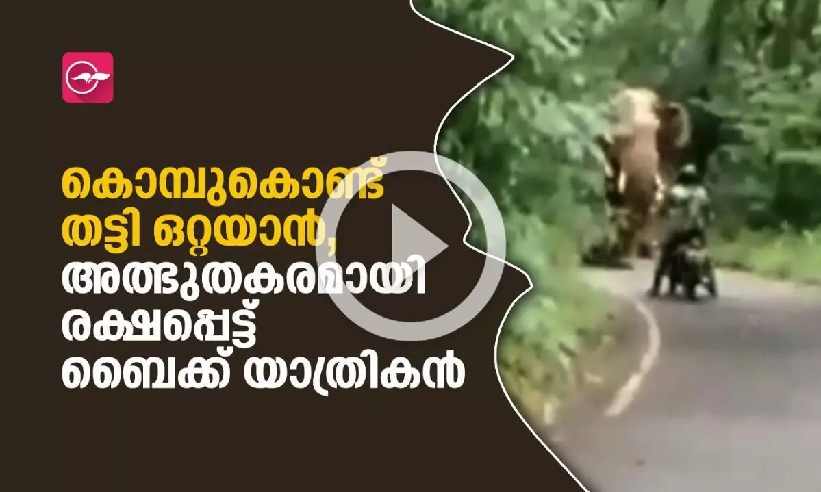 കൊമ്പുകൊണ്ട് തട്ടി ഒറ്റയാന്‍, അത്ഭുതകരമായ രക്ഷപ്പെട്ട് ബൈക്ക് യാത്രികൻ