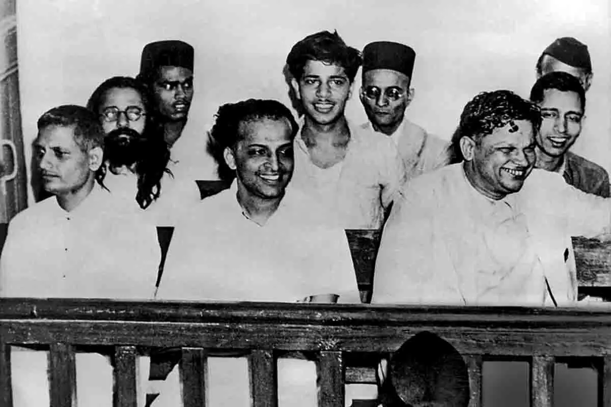 ഗാന്ധി വധക്കേസിലെ കുറ്റാരോപിതർ ചെങ്കോട്ടയിലെ കോടതിയിൽ. മുൻ നിര (ഇടത്തു നിന്ന്) നാഥുറാം ഗോഡ്സേ, നാരായൺ ആപ്തേ, വിഷ്ണു കർകറേ, രണ്ടാം നിര: ദിഗംബർ രാമചന്ദ്ര ബാഡ്ഗേ, ശങ്കർ കിസ്തയ്യ, ഗോപാൽ ഗോഡ്സേ, മൂന്നാം നിരയിൽ രണ്ടാമത് വി.ഡി സവർക്കർ, ഡോ. ദത്താത്രേയ സദാശിവ് പർച്ചുരേ.