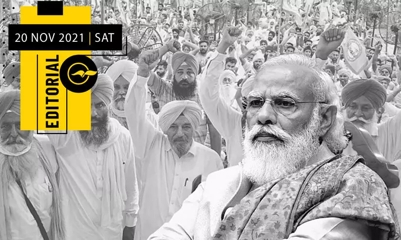 സ്വതന്ത്ര ഇന്ത്യയുടെ ചരിത്രത്തിലെ ഐതിഹാസിക ദിനമായിതന്നെ എണ്ണണം ഇനിമേൽ നവംബർ 19നെ. രാജ്യത്തെ കാർഷിക സമ്പത്തിനെയും കർഷകരെയും ചങ്ങാതിമുതലാളിമാരുടെ ചവിട്ടടിക്കീഴിലെത്തിക്കാൻ ലക്ഷ്യമിട്ട് നരേന്ദ്ര മോദി ഭരണകൂടം കൊണ്ടുവന്ന മൂന്ന് വിവാദ കാർഷിക നിയമങ്ങളെ 359 ദിവസം നീണ്ട സഹനസമരത്തിലൂടെ ഇന്ത്യ പൊരുതിത്തോൽപിച്ച സുദിനം. നിയമങ്ങൾ പിൻവലിക്കുന്ന പ്രശ്നമില്ലെന്ന് അഹങ്കരിച്ച സർക്കാർ കർഷകരുടെ നിശ്ചയദാർഢ്യത്തിനു മുന്നിൽ മുട്ടുകുത്തിയ മഹാദിനം. ആക്ഷേപിച്ചും അടിച്ചമർത്തിയും തുറുങ്കിലടച്ചും എത്രയൊക്കെ തകർക്കാൻ ശ്രമിച്ചിട്ടും പതറാതെ തളരാതെ നിന്ന് പൊരുതിയ കർഷകസമൂഹമേ, ആദരാഭിവാദ്യങ്ങൾ. ഇന്ത്യൻ ജനതയും ജനാധിപത്യവും നിങ്ങളോട് കടപ്പെട്ടിരിക്കുന്നു.