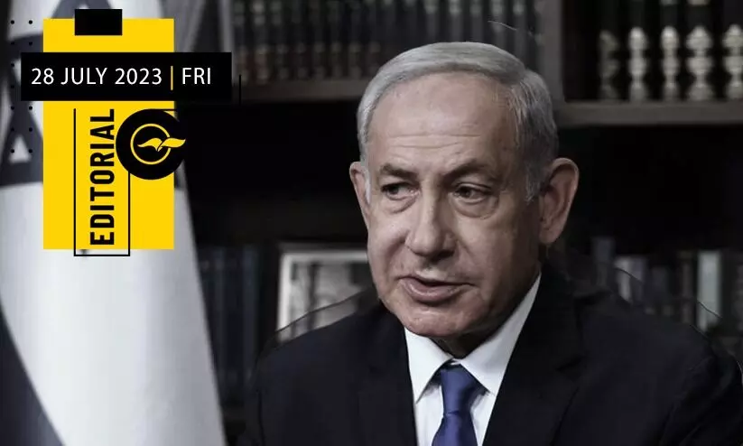 text_fieldsഇസ്രായേൽ പ്രധാനമന്ത്രി ബിന്യമിൻ നെതന്യാഹു തിങ്കളാഴ്ച പാർലമെന്റായ നെസറ്റിൽ പാസാക്കിയെടുത്ത ജുഡീഷ്യൽ പരിഷ്കരണ ബിൽ പ്രധാനമന്ത്രിയെന്ന നിലക്ക് നേടിയ വിജയമായാണ് ഗണിക്കപ്പെടുന്നത്. എന്നാൽ രാജ്യത്തിന്റെ ഘടനയിലും നിയമവ്യവസ്ഥയിലും അതിലുപരി ഫലസ്തീൻ ജനതയോടുള്ള സമീപനങ്ങളിലും ഇതുണ്ടാക്കുന്ന പ്രത്യാഘാതങ്ങൾ പ്രശ്നങ്ങൾ രൂക്ഷമാകാനാണിട എന്നു ചൂണ്ടിക്കാണിക്കപ്പെടുന്നു. ഹൃദ്രോഗബാധയെ തുടർന്ന് പേസ്മേക്കർ ഘടിപ്പിച്ച് ആശുപത്രി വിട്ടശേഷം നേരെ പാർലമെന്റിൽ വന്നായിരുന്നു നെതന്യാഹുവിന്റെ ബിൽ അവതരണവും വിജയപ്രകടനവും. ഇസ്രായേലി ജുഡീഷ്യറിയുടെ അധികാരങ്ങളിൽ കാര്യമായി കൈകടത്തുന്ന ഈ ബില്ലിനെതിരെ കഴിഞ്ഞ ആറു മാസമായി രാജ്യത്താകെ നടന്നുവരുന്ന കനത്ത പ്രതിഷേധങ്ങളും സമരങ്ങളും അവഗണിച്ചാണ് 120 അംഗ പാർലമെന്റിൽ 64 വോട്ടുകളുടെ പിൻബലത്തോടെ തീവ്രവലതുപക്ഷ- അതി യാഥാസ്ഥിതിക ഭരണമുന്നണി ബിൽ പാസാക്കിയെടുത്തത്. എതിരായി ഒറ്റവോട്ടും ഉണ്ടായില്ല; കാരണം പ്രതിപക്ഷം മൊത്തമായി സഭ ബഹിഷ്കരിച്ചിരുന്നു. അപ്പോഴും പാർലമെന്റിനു പുറത്ത് ആയിരക്കണക്കിനാളുകളുടെ പ്രതിഷേധം നടക്കുകയായിരുന്നു.