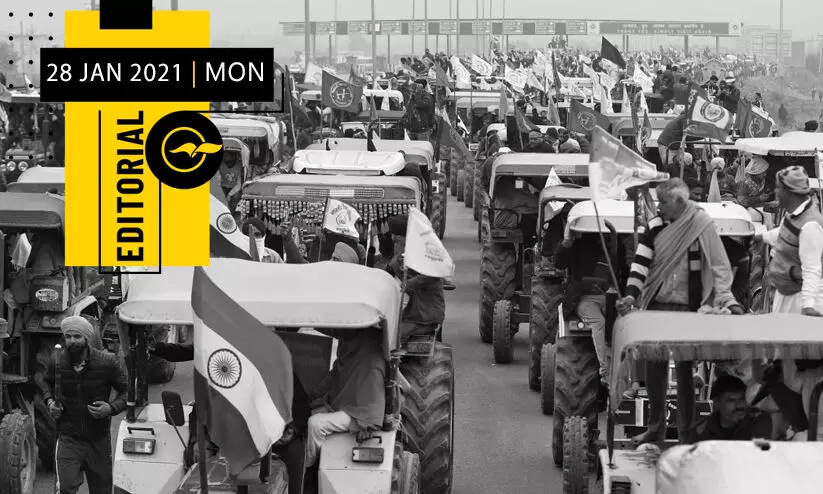 text_fieldsകർഷകരുടെയും രാജ്യത്തിെൻറയും അന്നംമുട്ടിക്കുന്ന മാരകനിയമങ്ങൾക്കെതിരെ കഴിഞ്ഞ നവംബർ 26ന് ആരംഭിച്ച കർഷകപ്രക്ഷോഭം ചൊവ്വാഴ്ച റിപ്പബ്ലിക്ദിനത്തിൽ രാജ്യതലസ്ഥാനത്തുണ്ടായ അനിഷ്ടസംഭവങ്ങളെത്തുടർന്ന് പുതിയ വഴിത്തിരിവിലെത്തിയിരിക്കുന്നു. രാജ്യം പരമാധികാര റിപ്പബ്ലിക്കായതിെൻറ 72ാം വാർഷികദിനത്തിൽ രാഷ്ട്രസമ്പദ്വ്യവസ്ഥയുടെ കാവൽക്കാരായ കർഷകരുടെ ജനാധിപത്യപ്രക്ഷോഭം സംഘർഷത്തിലേക്കു വഴിമാറിയത് സമരത്തെ താറടിച്ചു തകർക്കാൻ ശ്രമിക്കുന്നവർക്ക് വീണുകിട്ടിയ വടിയായി. ചർച്ചക്കുവിളിച്ച മന്ത്രിമാരുടെ ചായപോലും വേണ്ടെന്നുവെച്ചും സമരനിരയിൽ അതിക്രമമുണ്ടാക്കാൻ നുഴഞ്ഞുകയറിയവരെ ജാഗ്രതയോടെ കാവലിരുന്ന് പിടികൂടിയും പ്രലോഭനത്തിലും പ്രകോപനത്തിലും വീണുപോകാതെ സമരത്തെ മുന്നോട്ടുനയിച്ചുവരുകയായിരുന്ന കർഷകസംഘടനകളെ പ്രതിരോധത്തിലാക്കുന്നതായി ന്യൂഡൽഹിയിലെ അനിഷ്ടസംഭവങ്ങൾ. അതോടെ, പതിനൊന്നു വട്ടം ചർച്ചകൾക്കുശേഷവും പരിഹാരം കാണാതെ നീണ്ടുപോയ പ്രക്ഷോഭത്തെ കലാപമുദ്രകുത്തി കേസുകളിലും നിയമവ്യവഹാരങ്ങളിലും കുരുക്കിയിടാനുള്ള ശ്രമത്തിലാണ് കേന്ദ്ര സർക്കാർ എന്നിടത്തേക്കാണ് കാര്യങ്ങൾ നീങ്ങുന്നത്.