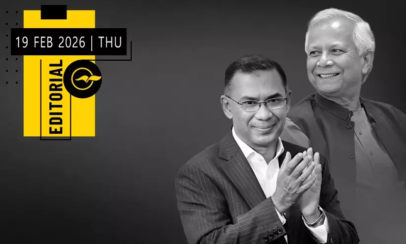 text_fieldsഫെബ്രുവരി 12നു ബംഗ്ലാദേശിൽ നടന്ന പതിമൂന്നാമത് പാർലമെന്റ് തെരഞ്ഞെടുപ്പിൽ വൻവിജയം നേടി അധികാരത്തിൽ വന്ന ബംഗ്ലാദേശ് നാഷനൽ പാർട്ടി (ബി.എൻ.പി) നേതാവ് താരിഖ് റഹ്മാൻ ചൊവ്വാഴ്ച പതിനൊന്നാം പ്രധാനമന്ത്രിയായി അധികാരമേറ്റു. ഇതോടെ, 2024 ജൂണിൽ വിദ്യാർഥി പ്രക്ഷോഭമായി ആരംഭിച്ച അനിശ്ചിതത്വങ്ങൾ തൽക്കാലം ശമിച്ചു എന്നു പറയാം. മുൻ പ്രധാനമന്ത്രി ഖാലിദ സിയയുടെയും മുൻ പ്രസിഡന്റ് ജനറൽ സിയാഉർറഹ്മാന്റെയും മകനായ താരിഖ് റഹ്മാൻ രാഷ്ട്രീയ ഭൂതകാലത്തിന്റെ ഭാണ്ഡം പേറാതെയാണ് അധികാരത്തിലെത്തിയിരിക്കുന്നത്. മൂന്നിൽ രണ്ടു ഭൂരിപക്ഷം നേടിയ കക്ഷി എന്ന നിലയിൽ ബി.എൻ.പി സഖ്യത്തിന് ഭരണപരമായ തീരുമാനങ്ങൾ എളുപ്പമാവും. 77 സീറ്റുകൾ നേടിയ ജമാഅത്തെ ഇസ്ലാമി സഖ്യം ഉത്തരവാദിത്തവും ജാഗ്രതയുമുള്ള പ്രതിപക്ഷമായിരിക്കും എന്നാണ് ജമാഅത്തെ ഇസ്ലാമി നേതാവ് ഷഫീഖ് റഹ്മാൻ പറഞ്ഞത്.