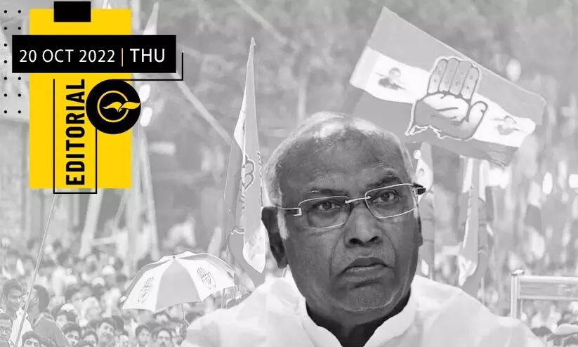 text_fields137 വയസ്സെത്തിയ ഇന്ത്യൻ നാഷനൽ കോൺഗ്രസിന്റെ പുതിയ അമരക്കാരനായി കർണാടകയിൽനിന്നുള്ള കരുത്തനായ നേതാവ് മല്ലികാർജുൻ ഖാർഗെ തെരഞ്ഞെടുക്കപ്പെട്ടിരിക്കുന്നു. 24 വർഷത്തിനുശേഷം 'ഗാന്ധി' കുടുംബാംഗമല്ലാത്ത ഒരാൾ കോൺഗ്രസിന്റെ സാരഥിയാകുന്നത് ഏറെ ശോഷിച്ചുപോകുകയും പുനരുജ്ജീവന പ്രതീക്ഷകൾ നഷ്ടമാകുകയും ചെയ്ത പാർട്ടിയെ അധികാരത്തിന്റെ ഇടനാഴികളിലേക്ക് തിരിച്ചുകൊണ്ടുവരുക, വിഭിന്ന രാഷ്ട്രീയ കൈവഴികളെ ഏകോപിപ്പിച്ച് ശക്തമായ രാഷ്ട്രീയ ചേരി നിർമിക്കുക തുടങ്ങിയ അത്ഭുതവൃത്തികൾക്കുവേണ്ടിയാണ്. തീർച്ചയായും ഭാരിച്ച ഈ ചുമതല ഏറ്റെടുക്കാനും അഭിമുഖീകരിക്കാനും നെഹ്റു കുടുംബത്തിന്റെ മുഴുവൻ പിന്തുണയും അദ്ദേഹത്തിനുണ്ട്. പോൾ ചെയ്ത വോട്ടിൽ മഹാഭൂരിപക്ഷവും നേടാനായതിലൂടെ സംസ്ഥാന നേതൃത്വങ്ങളുടെ പിന്തുണയുമുണ്ടെന്ന് ഉറപ്പിക്കാം. ഈ പദവി തെരഞ്ഞെടുപ്പ് പ്രക്രിയയിലൂടെ ലഭിച്ചുവെന്നത് മറ്റ് ആശ്രിതത്വബോധമില്ലാതെ കാര്യങ്ങൾ നിർവഹിക്കാനുള്ള ആത്മവിശ്വാസവും അദ്ദേഹത്തിന് പ്രദാനംചെയ്യുന്നുണ്ട്. ആ അർഥത്തിൽ ഖാർഗെയും കോൺഗ്രസും നന്ദി പറയേണ്ടത് ഡോ. ശശി തരൂരിനോടാണ്.